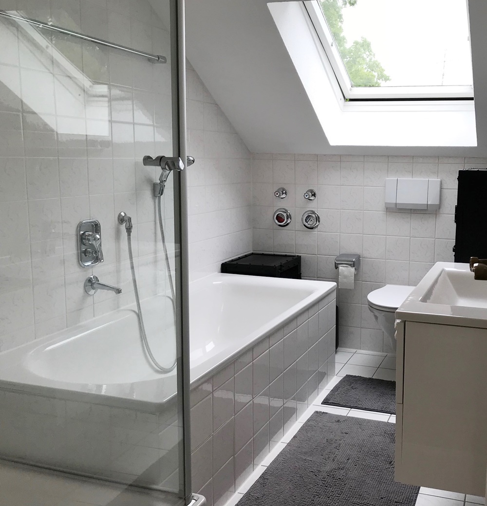 Sanitäre: Wanne, Duschtasse mit Regendusche, WC, Waschbecken, Wasserzähler
