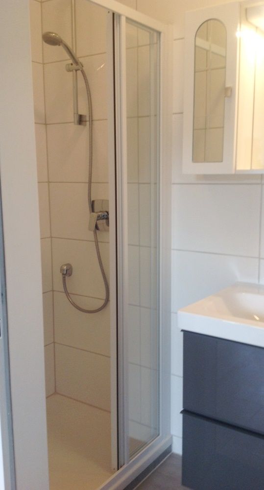 Sanitär: neu - Dusche, WC, Waschbecken mit Unter- und Oberschrank