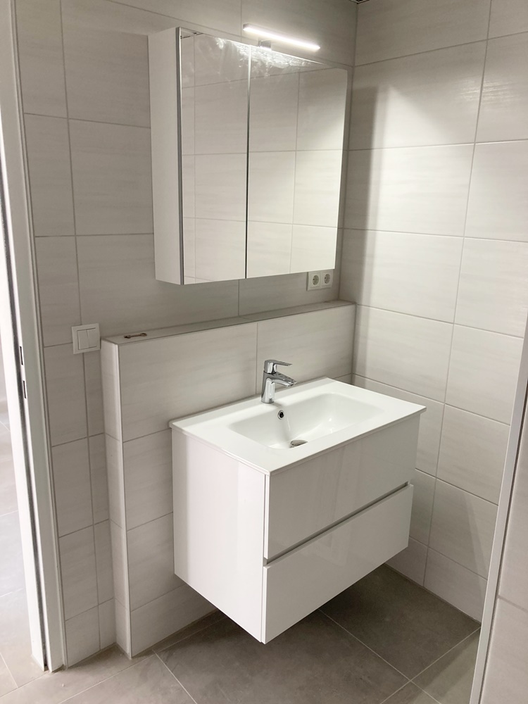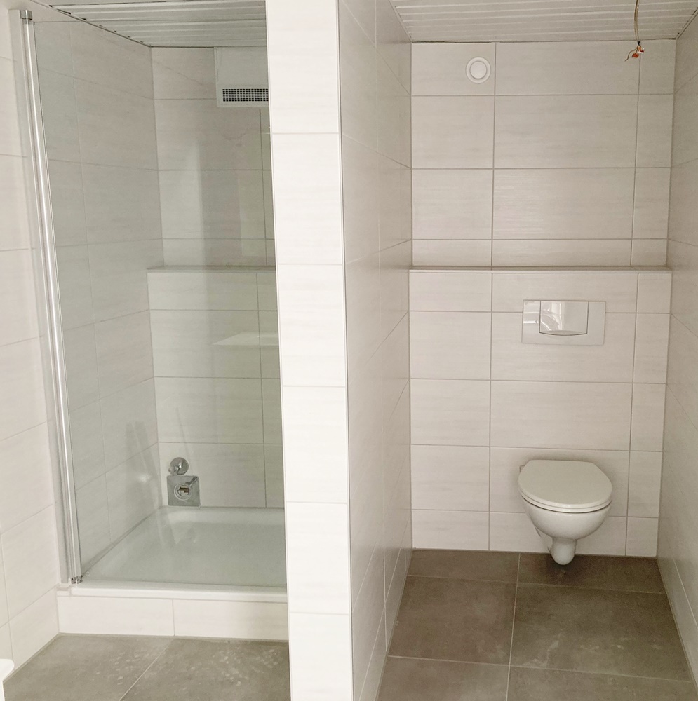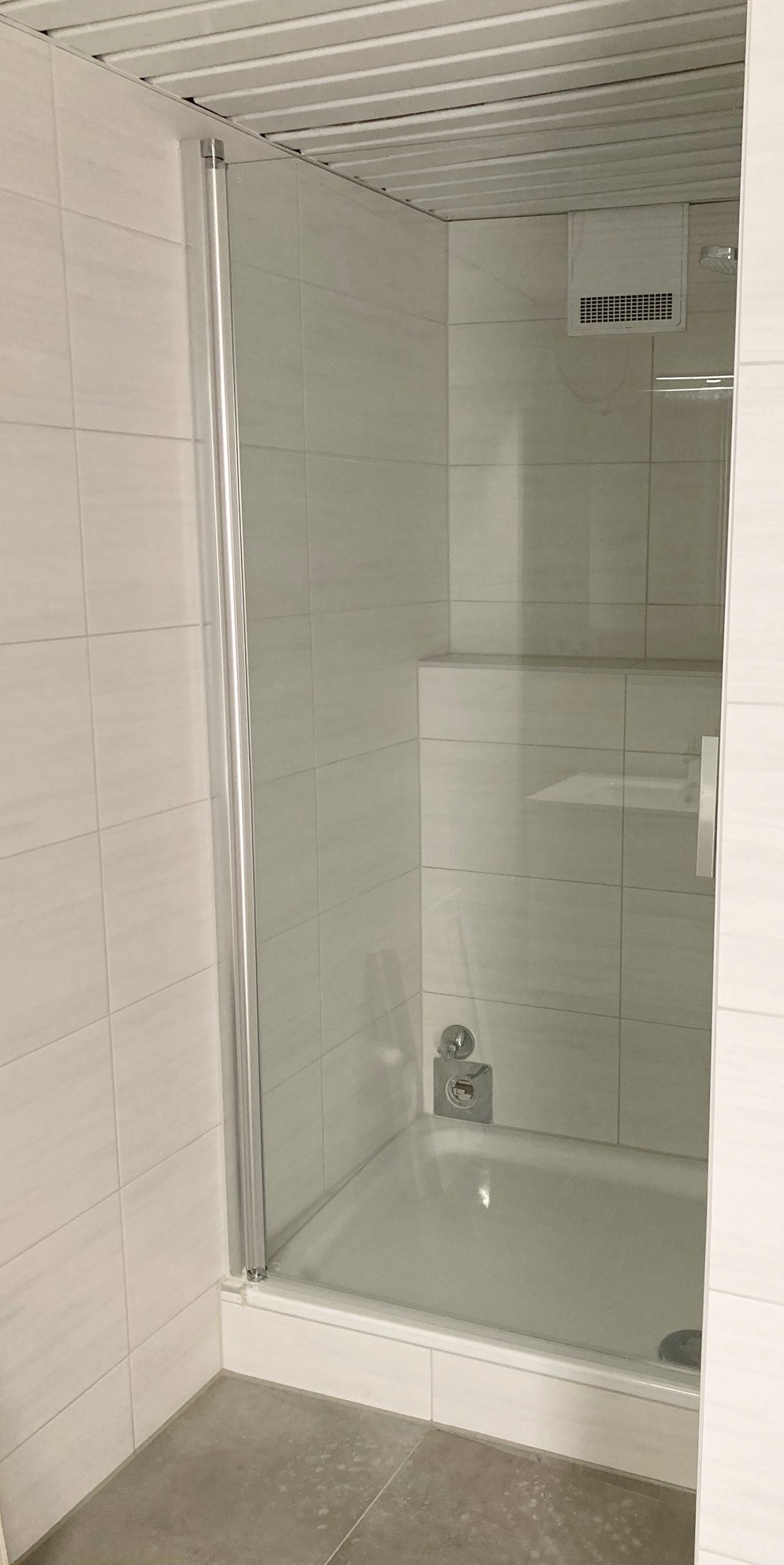 klare Sanitärausstattung, Dusche mit Glastüre, Waschbecken mit Ober- und Unterschrank, WC.